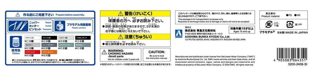 From Aoshima Bunka Kyozai Co. Designed by the renowned Italian designer Giorgetto Giugiaro and manufactured by Lotus, the DeLorean DMC-12 is an iconic sports car distinguished by its unpainted steel body and distinctive gull-wing doors. Despite its limited production run, the DeLorean continues to command a passionate fanbase. Now, enthusiasts can rejoice as this legendary automobile is brought back to life in a meticulously detailed 1/24 scale plastic model. Featuring newly added molds, the model accurately replicates the DeLorean's iconic features, including its operable gull-wing doors and rear cover. The engine is faithfully reproduced, and a set of decals is included for added authenticity. Specifications for this model include a 1/24 scale, with dimensions approximately 6.89 inches in length, crafted from PS body material, and equipped with rubber tires. Get ready to embark on a journey through automotive history with this exceptional DeLorean DMC-12 model.